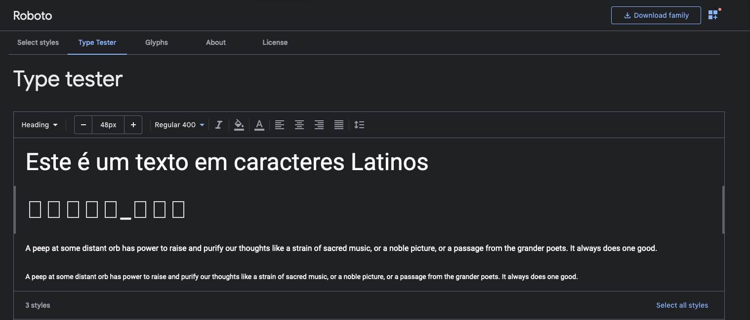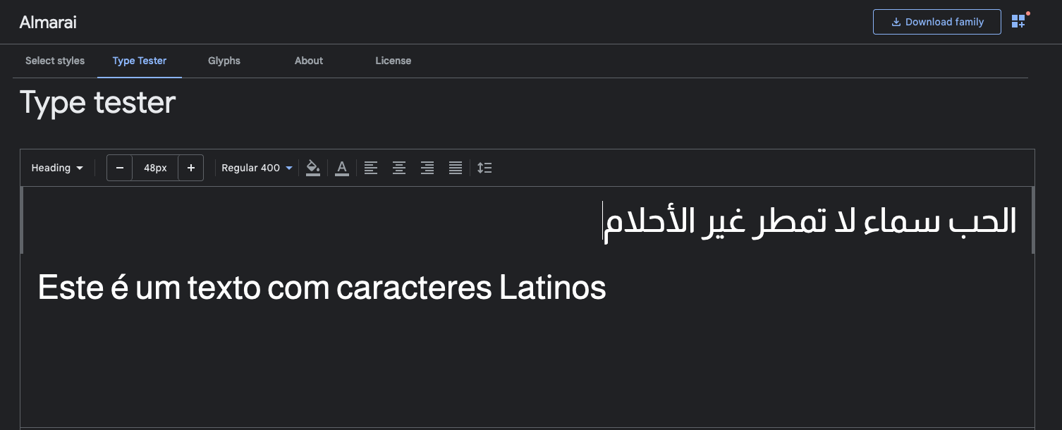 Uma forma de testar isso é navegar no Google Fonts é possível fazer busca de fontes que suportes idiomas específicos. No exemplo abaixo comparei o suporte a um texto árabe com a Roboto e a fonte específica Almarai que suporta além dos caracteres latinos, também caracteres árabes e que foi a minha escolha dar suporte aos textos árabes dentro do projeto Hashflags Bot.